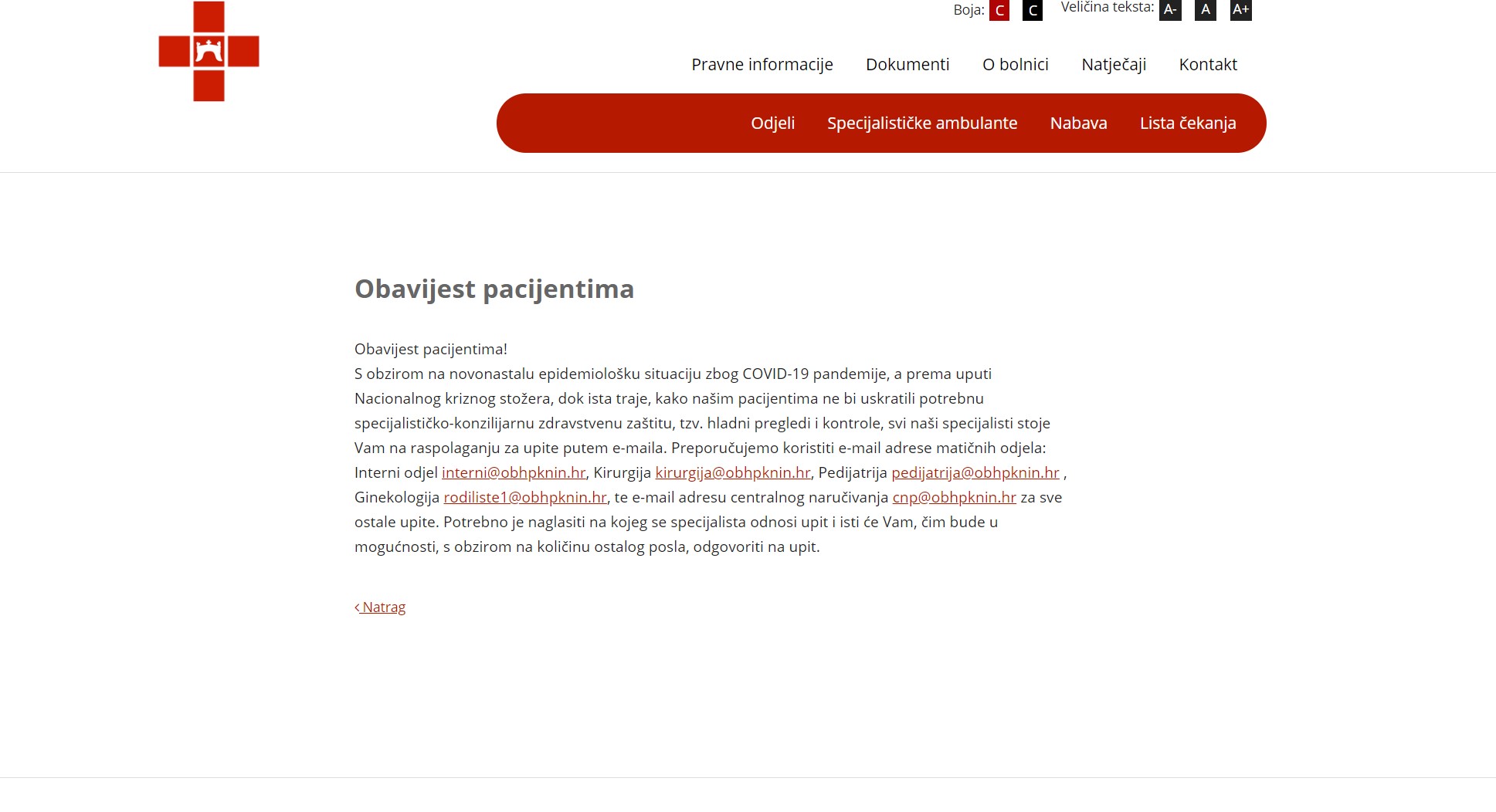 Zbog epidemiološke situacije vezane za COVID-19 pandemiju, a prema uputi Nacionalnog kriznog stožera, kako naši pacijenti ne bi ostali prikraćeni za polikliničko-konzilijarnu zdravstvenu zaštitu, tzv. hladne preglede i kontrole, omogućili smo na našim službenim stranicama https://www.obhpknin.hr/, u rubrici “Najnovije vijesti” postavljanje upita u vezi istih svim našim specijalistima, koji će odgovore na upite dati u najbržem mogućem roku. Navedeni režim vrijedi sve do normaliziranja epidemiološke situacije i ponovnog pokretanja tzv. hladnog pogona, o čemu ćemo Vas pravodobno izvijestiti. E-mail adrese Odjela navedene su u obavijesti. Potrebno je samo u e-mailu odgovarajućem Odjelu naglasiti na kojeg se specijalista (kod kojeg se i inače pacijent vodi) upit odnosi.